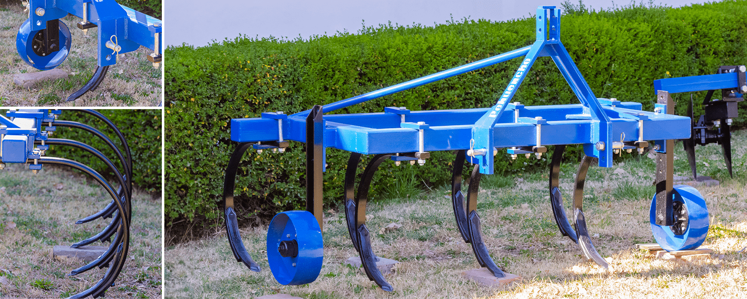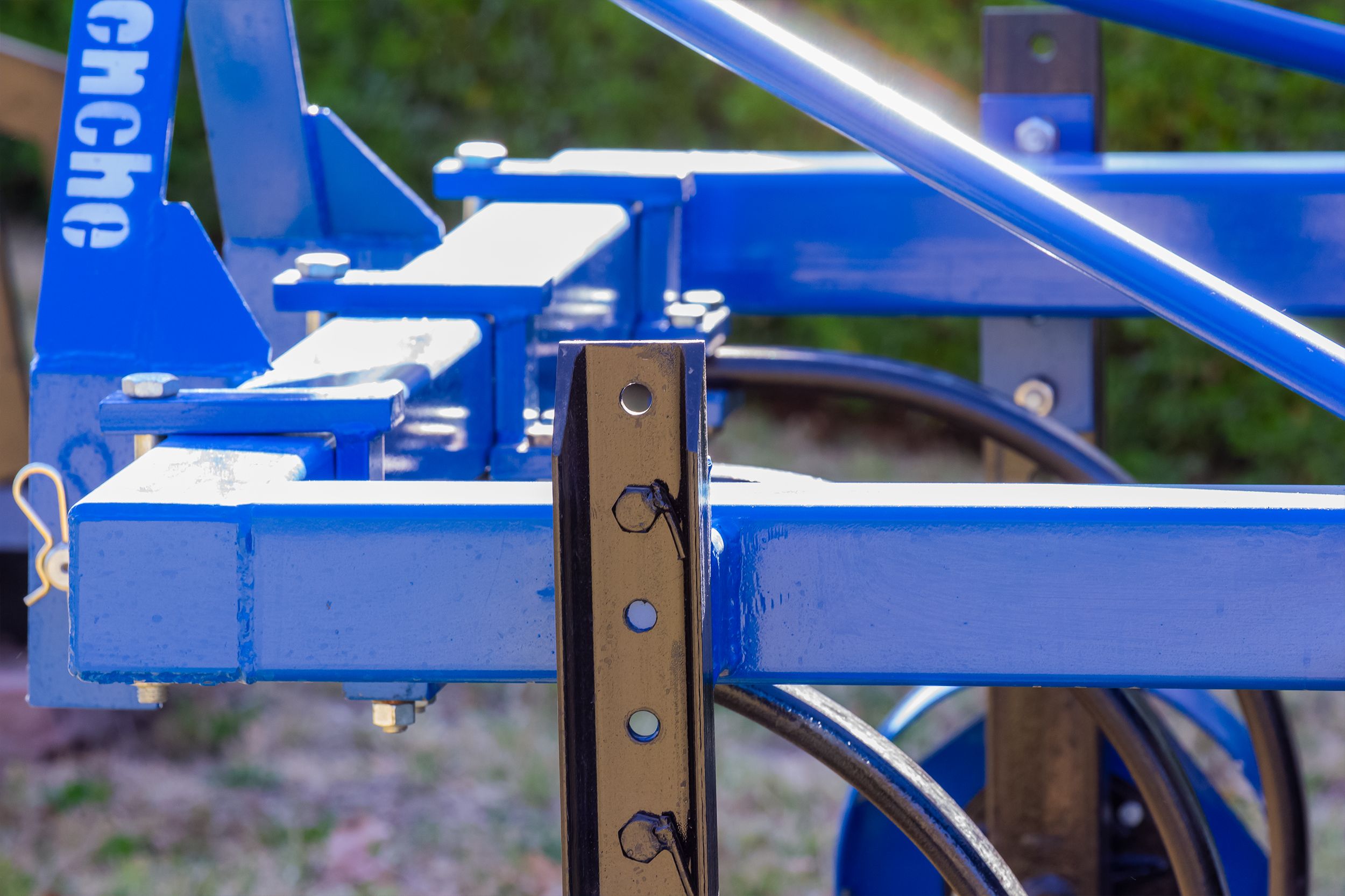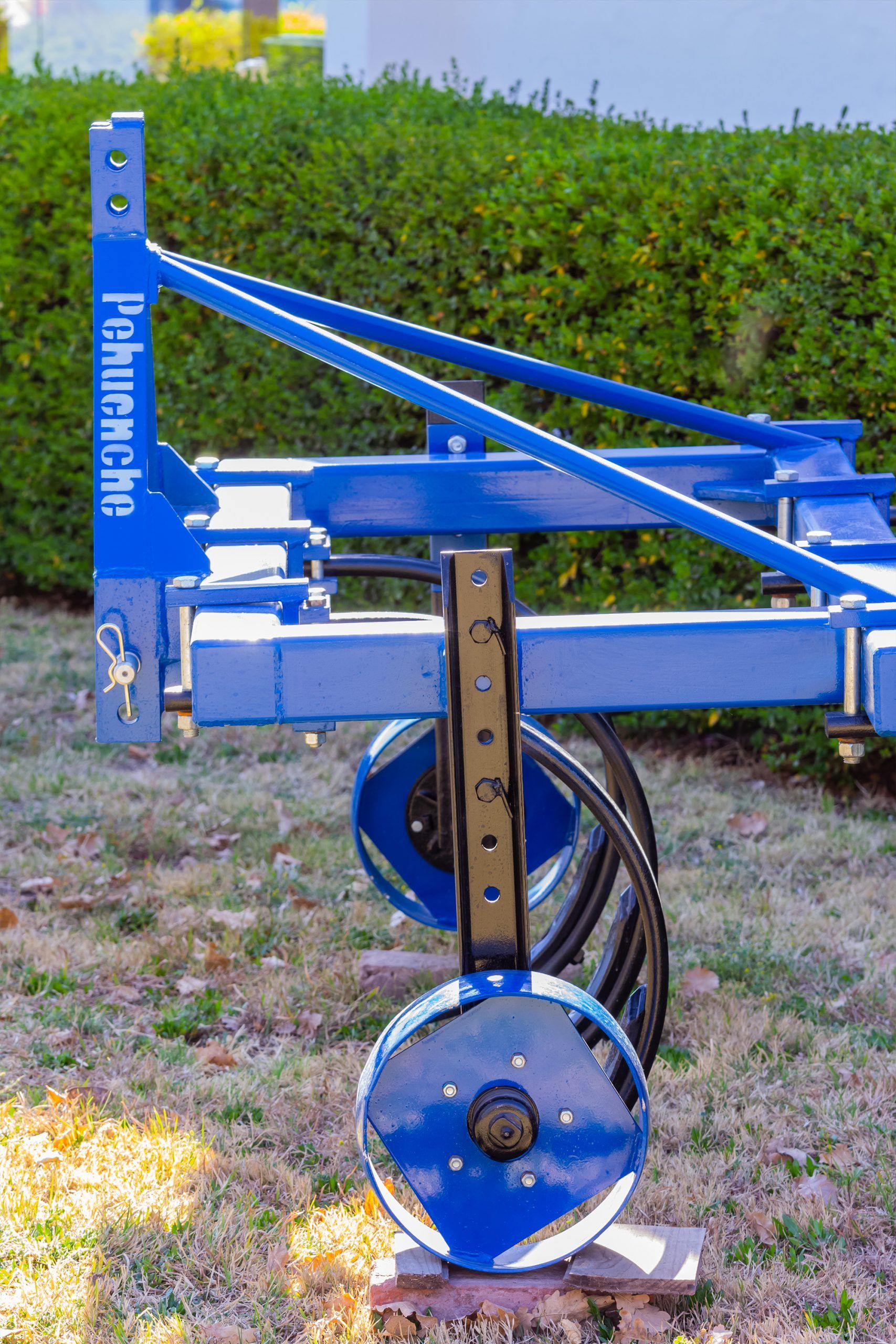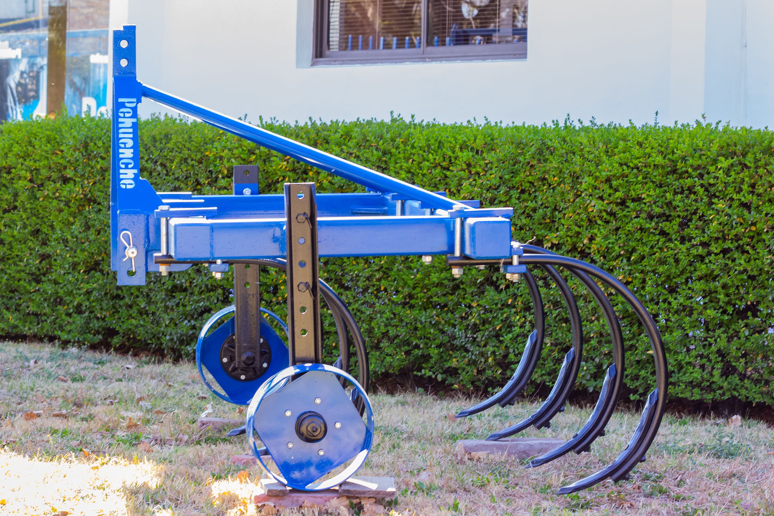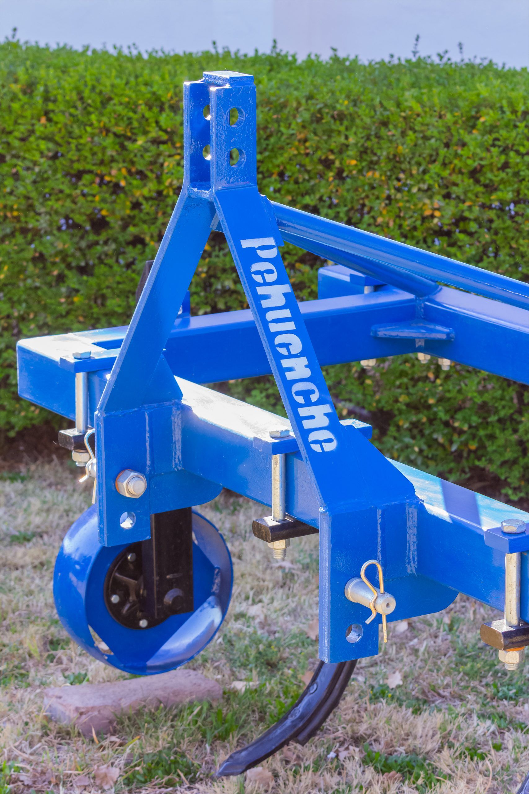 De acoplamiento hidráulico de tres puntos. Ruedas para control de profundidad de hierro. Arcos de cinceles de 1″ x 2″. Placas fijas con fusibles. La distancia entre cinceles puede ser regulada entre 250 a 350 mm.
