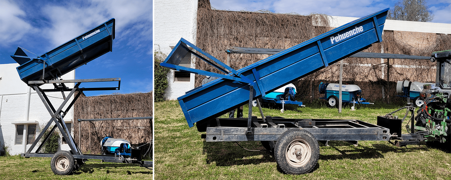 Para ser enganchado en la parte superior del tractor para circular entre viñedos. Incluye: central hidráulica, tanque de aceite y multiplicadora toma de fuerza. Accionamiento hidráulico para subir y volcar sobre baranda de camión a mínimo 360cm del piso