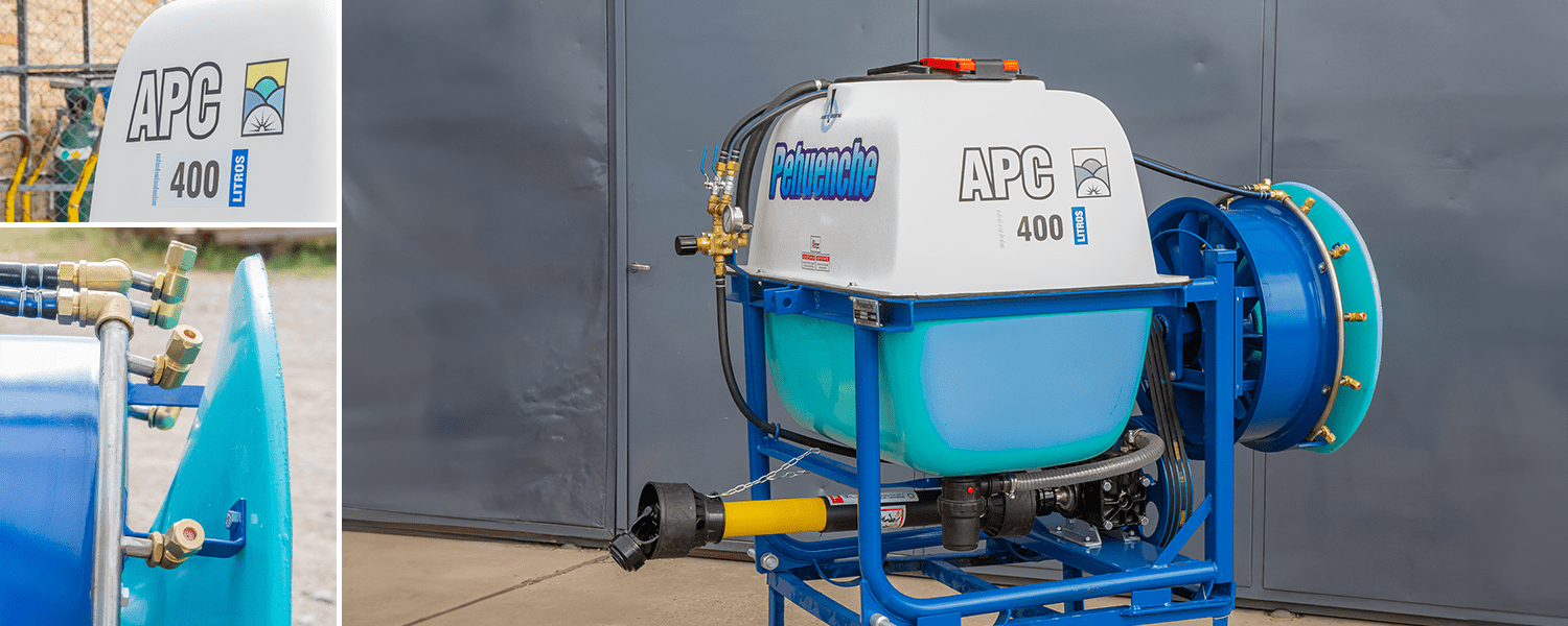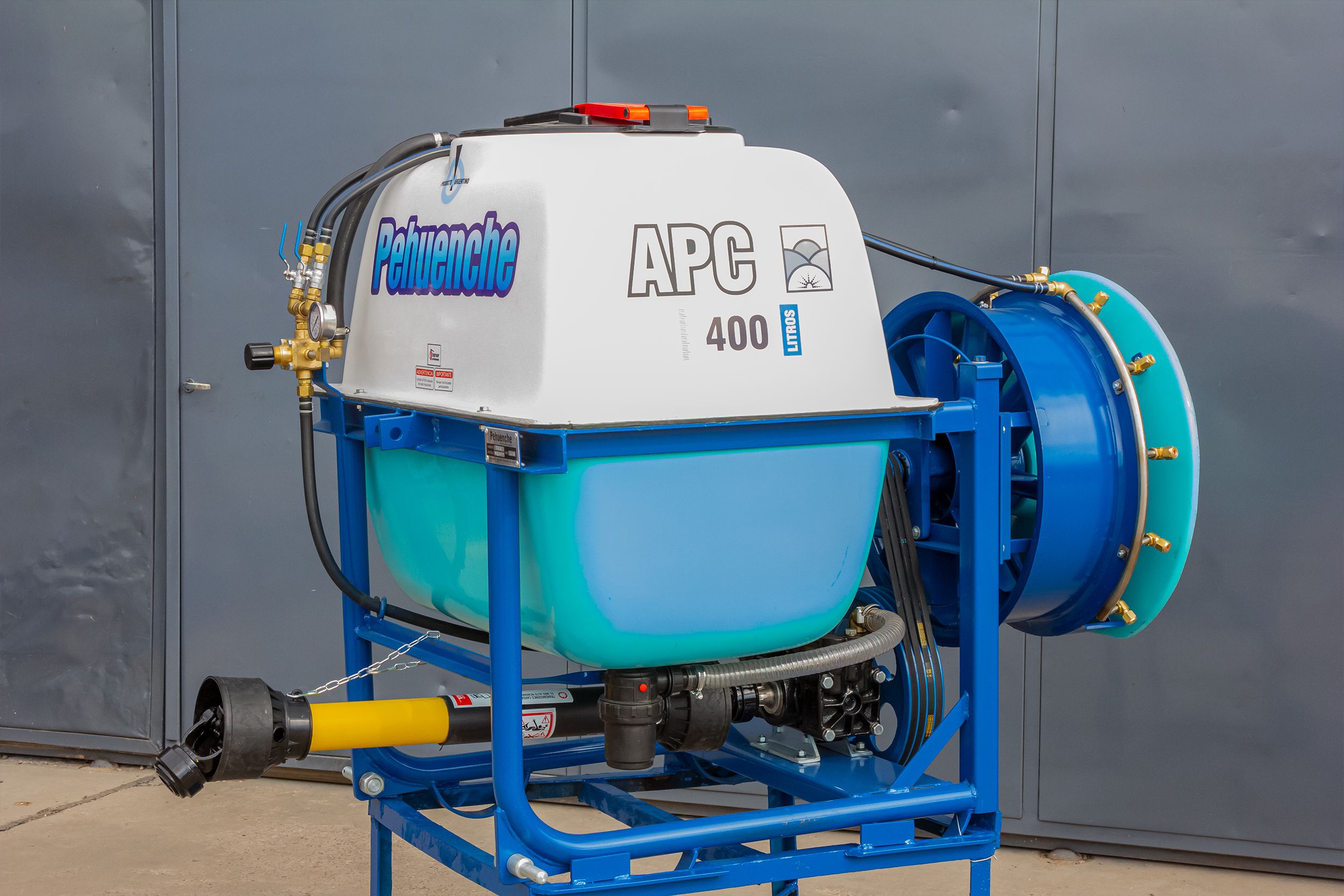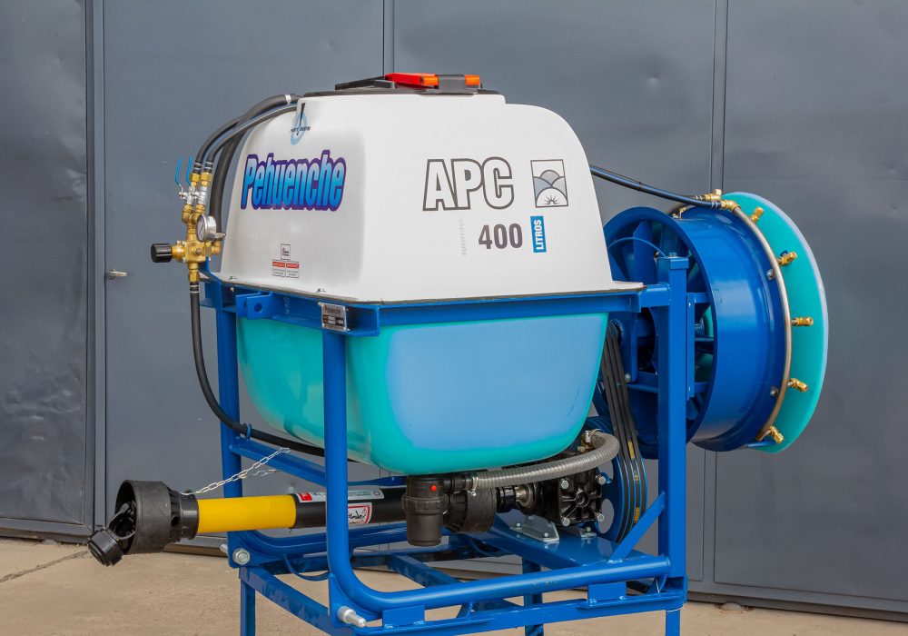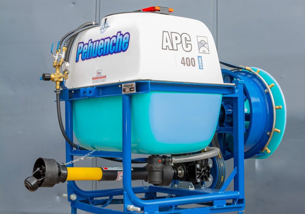 Para aplicar al levante hidráulico del tractor, para fumigar viñedos hélice de 0,6 mts. 10 boquillas con pastillas de cerámica. Permite el reemplazo de la hélice por aguilones sin ninguna modificación.